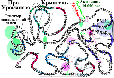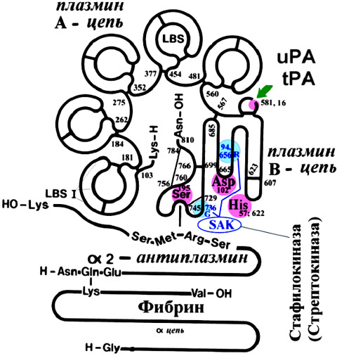 Указаны сайты специфической активации (процессинга) фибрин-связанного плазминогена Пуролазой и активации (путем образования комплекса) тотального (в т.ч. циркулирующего) плазминогена бактериальным белком, тромболитиком 1-го поколения, Стрептокиназой.